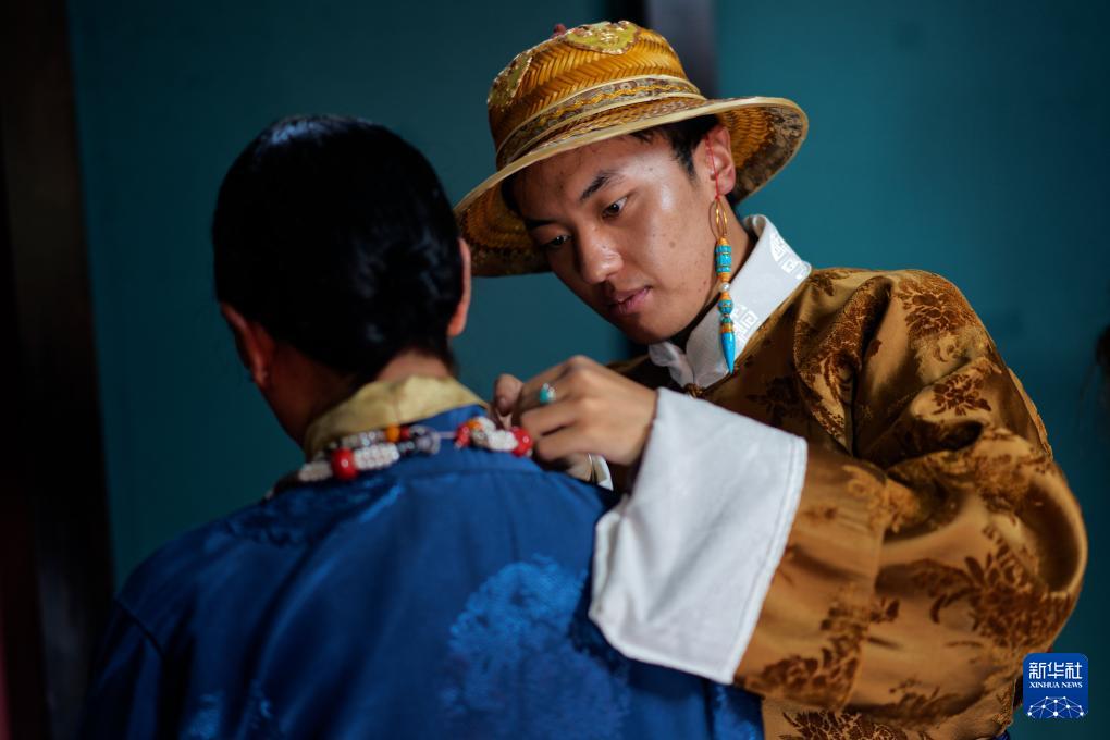 班珠丹塔為模特調整藏裝配飾(9月9日攝)。新華社記者 張笑宇 攝