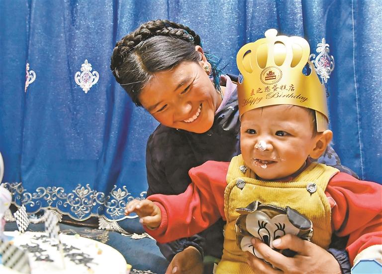 圖為1月8日,母親朋瓊正在為地震寶寶次仁拉巴過生日。本報記者 旦增蘭澤 攝