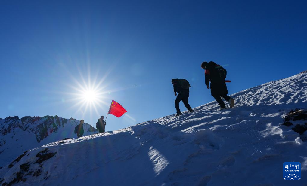 冬日時節,西藏山南市隆子縣玉麥鄉的群山覆蓋著積雪。4名護邊員晨光中行進在雪山間,50歲的普布羅布肩扛國旗,走在隊伍最前面,索朗多吉、拉巴次仁、洛桑羅布緊跟其后。