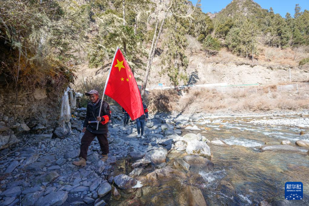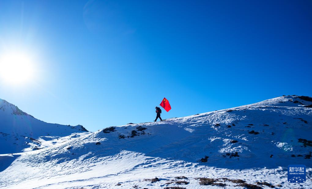 在西藏山南市隆子縣玉麥鄉境內,護邊員普布羅布扛著國旗行走在雪坡上(2月6日攝)。新華社記者 丁增尼達 攝
