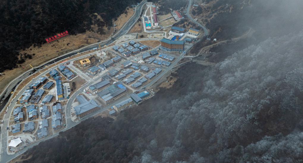 這是2月5日拍攝的云霧中的玉麥鄉玉麥村全景(無人機照片)。新華社記者 丁增尼達 攝