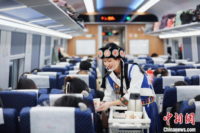 “歡迎大家嘗嘗我們列車上的酥油茶,正宗的咧。”飛馳的列車上,格茸培楚身著藏族服飾,用藏語和普通話向乘客介紹著列車上充滿民族風(fēng)味的特色飲品和美食。
