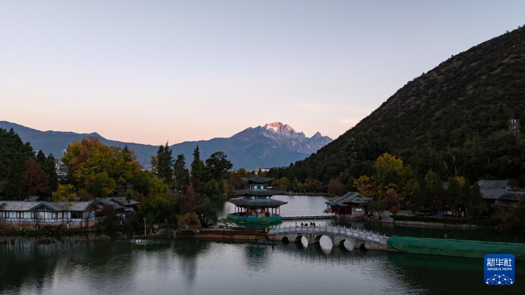 12月9日,游客在麗江市黑龍潭公園觀賞玉龍雪山“日照金山”美景(無人機照片)。新華社記者 孟濤 攝
