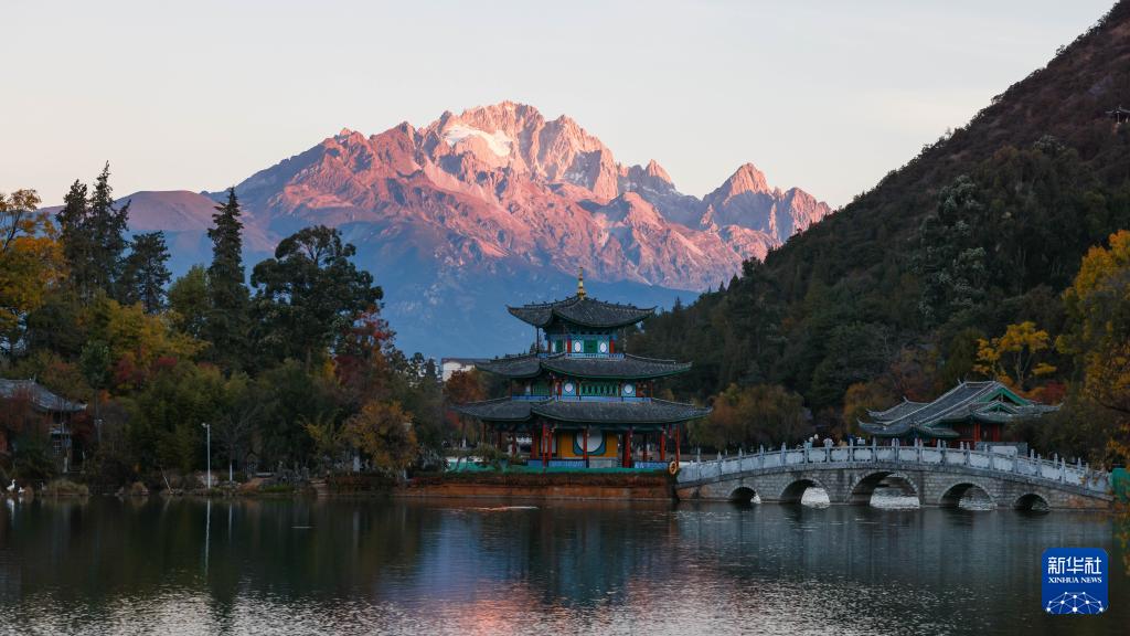 玉龍雪山位于云南省麗江市西北部,終年積雪,銀裝素裹。仲冬時節,隨著旭日東升,晨輝漸漸灑滿山巔,山下層林盡染,城市悄然蘇醒,一幅和諧靈動的生態畫卷徐徐展開。