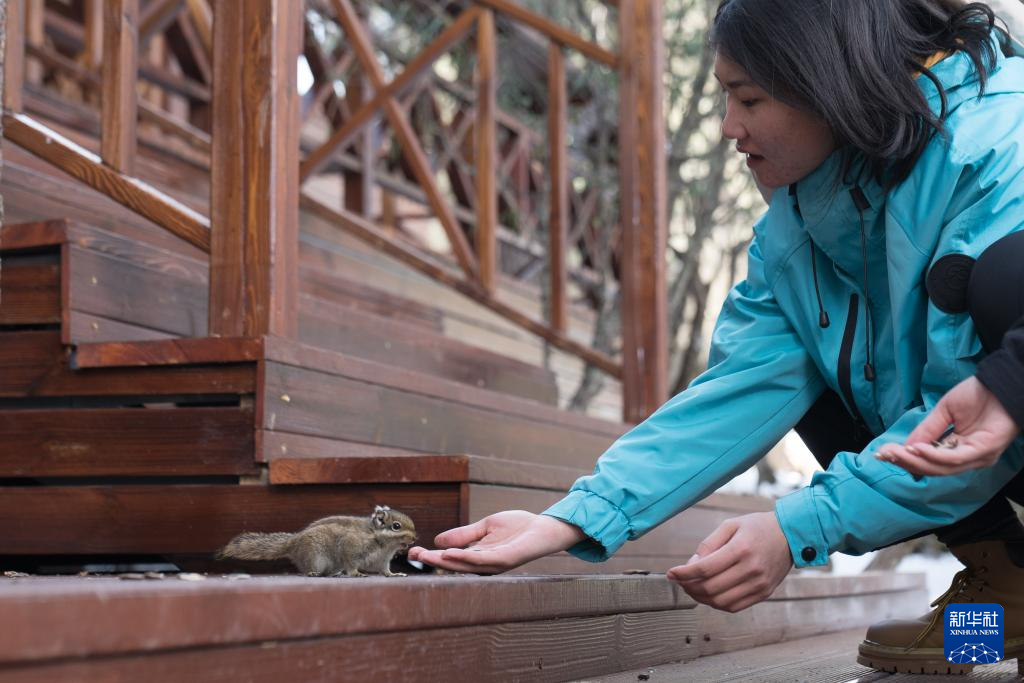 2月23日,游客在普達措景區投喂松鼠。新華社 彭奕凱 攝