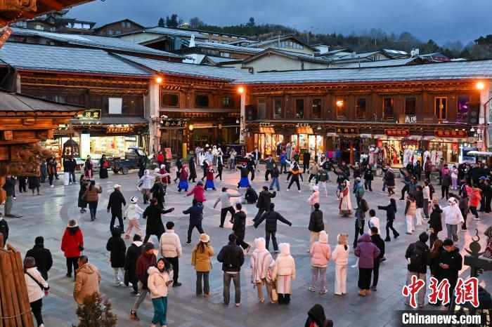 3月1日,游客在獨克宗古城與當?shù)鼐用褚煌鴱V場舞。中新社記者 李嘉嫻 攝