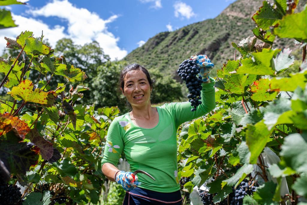 2021年9月14日,云南省迪慶藏族自治州德欽縣云嶺鄉(xiāng)紅坡村農(nóng)民展示自家種植的葡萄。新華社記者 胡超 攝