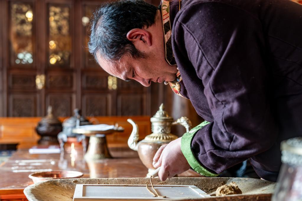 2025年3月6日,在香格里拉市松林藏香非遺傳承館,藏族漢子向巴江參在制作藏香。新華社記者 胡超 攝