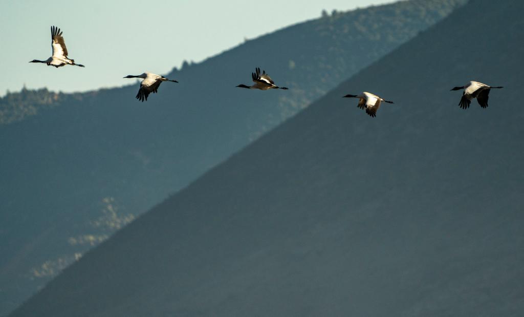 2021年10月29日,黑頸鶴飛翔在納帕海上空。新華社記者 江文耀 攝