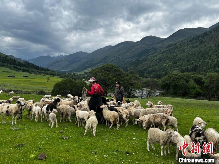 央宗措姆與媽媽七林央宗在星沾牧場照看綿羊。時文枝 攝