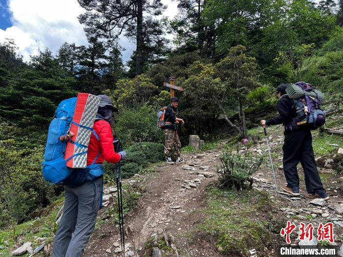 前往南寶牧場(chǎng)的路上,央卓七林(左二)為兩位徒步愛(ài)好者引路?!r(shí)文枝 攝