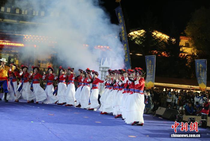 9月27日晚,麗江市代表隊表演舞蹈《幸福甲搓》。中新社記者 黃興鴻 攝
