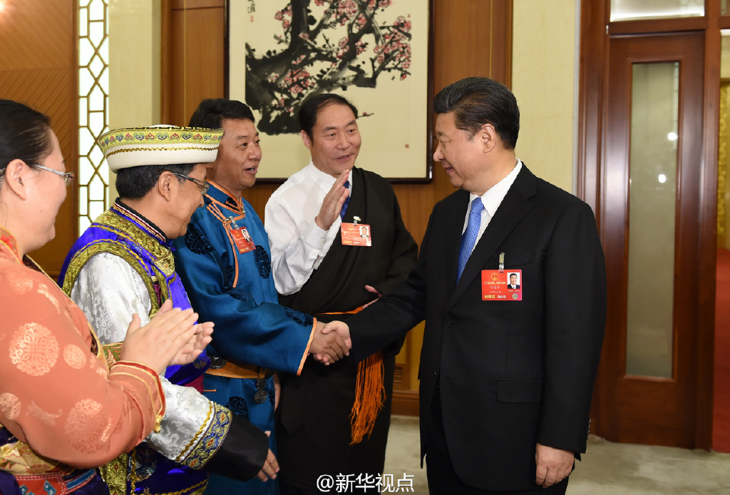 10日上午,習近平來到青海代表團參加審議。當總書記走進會場時,藏族、蒙古族、土族3位代表分別向總書記獻上潔白的哈達,表達對黨中央和總書記的敬意。習近平請他們轉達對各族人民的祝福。審議中,幾位少數民族代表就民族團結進步、促進城鄉教育公平、實施精準扶貧等發言。習近平不時詢問具體情況,強調多民族是我國一大特色,是我國發展的一大有利因素。要著力增強民族地區自我發展能力和可持續發展能力,尊重民族差異、包容文化多樣,讓各民族在中華民族大家庭中手足相親、守望相助、團結和睦、共同發展。XuE中國藏族網通