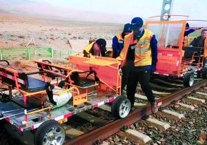 先是趴下,臉幾乎貼到鋼軌上,目測水平度;在關鍵處,用軌尺量水平、軌距;往前行進時,用長柄檢查錘敲擊鋼軌和固定鋼軌的每一個扣件……MYM中國藏族網通