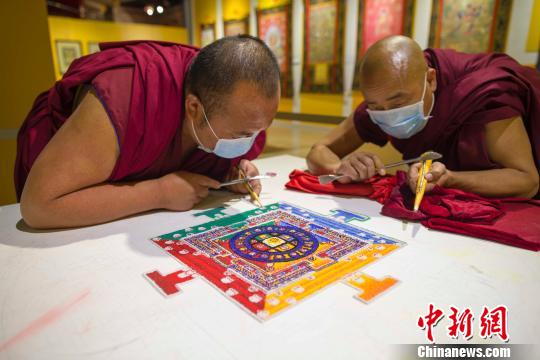 4月21日,“藏傳之光”西藏宗教藝術品展正在山西太原展出。其中,藏傳佛教中神秘的藝術“壇城沙畫”也在此亮相,兩名來自青海省的師父將花費五天時間在現場作畫,為民眾完整呈現出了藏傳佛教中這一獨特、精致的宗教藝術。