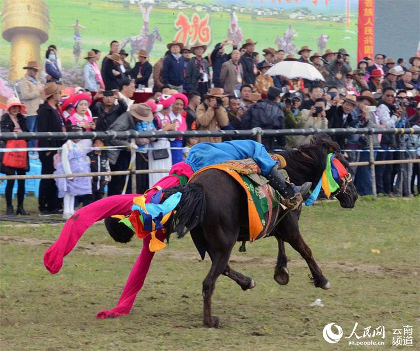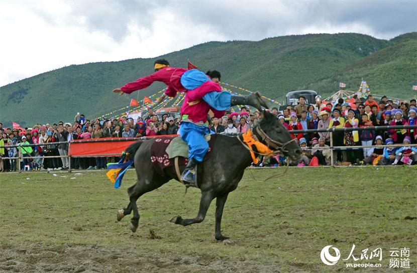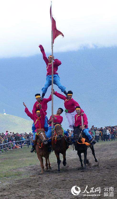 隨著裁判的指令搶一響,訓練有素的馬術選手們瘋狂地在風馳電掣的馬背上表演站立、倒立、跨立、多人疊立等動作,無比驚險刺激,稍有差池將人仰馬翻傷亡難料。現場的空氣都是緊張的,激昂的賽馬樂、尖叫聲、歡呼聲瘋狂地覆蓋了香格里拉仙人洞賽馬場的每一寸土地。zzd中國藏族網通