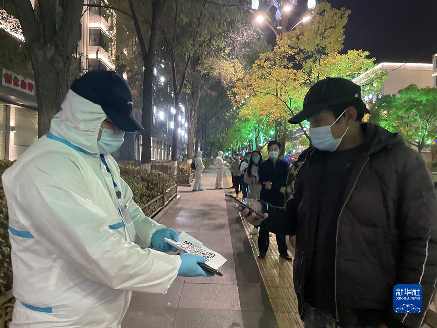 身著防護服,手拿二維碼,志愿者楊生軍往返隊首與隊尾之間,提醒大家保持距離,戴好口罩,提前掃碼。三百多米長的核酸檢測隊伍,楊生軍一下午來回走了一萬多步。