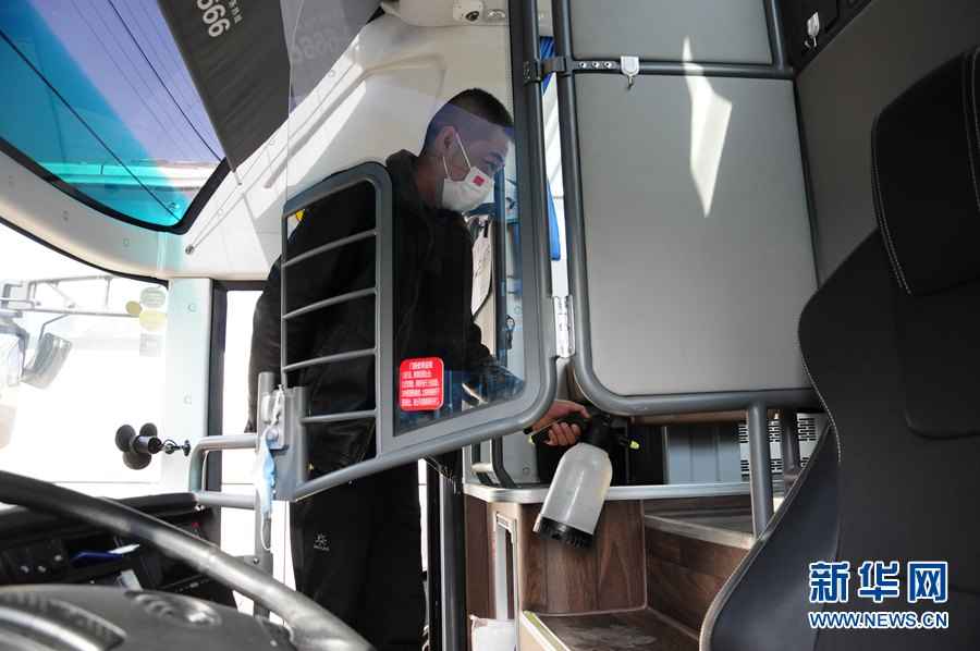 袁孝兵在用消毒液擦拭客車扶手。新華社記者 王浡 攝uSO中國藏族網通