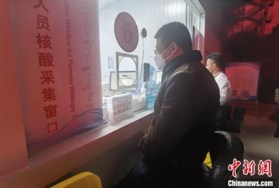 圖為核酸采集窗口前排隊等候的市民。 潘雨潔 攝