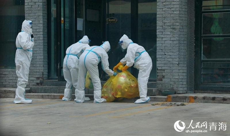 隔離點(diǎn)內(nèi),工作人員正在清理垃圾。人民網(wǎng) 張皓芃攝