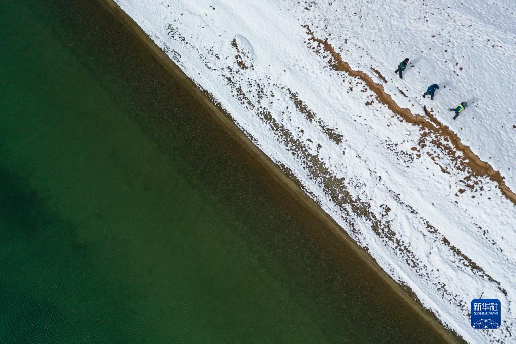 2021年10月20日,在青海省果洛藏族自治州瑪多縣扎陵湖鄉勒那村,三江源國家公園黃河源園區生態管護員在巡護(無人機照片)。新華社記者 張龍 攝