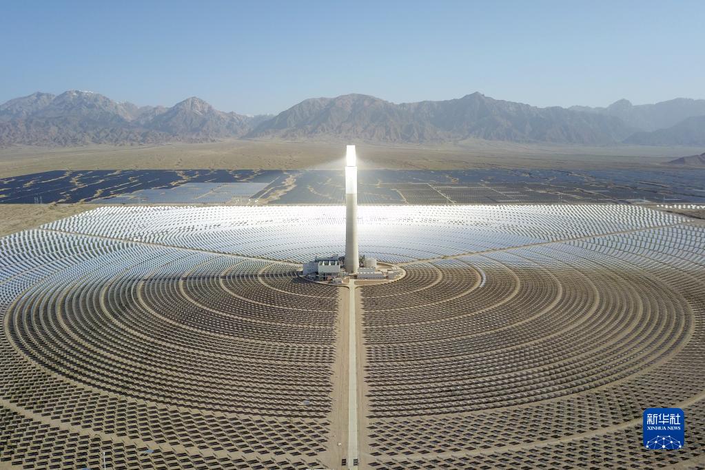這是2022年6月8日在青海省海西蒙古族藏族自治州德令哈市光伏(光熱)產業園拍攝的青海中控德令哈50兆瓦光熱電站(無人機照片)。新華社記者 范培珅 攝