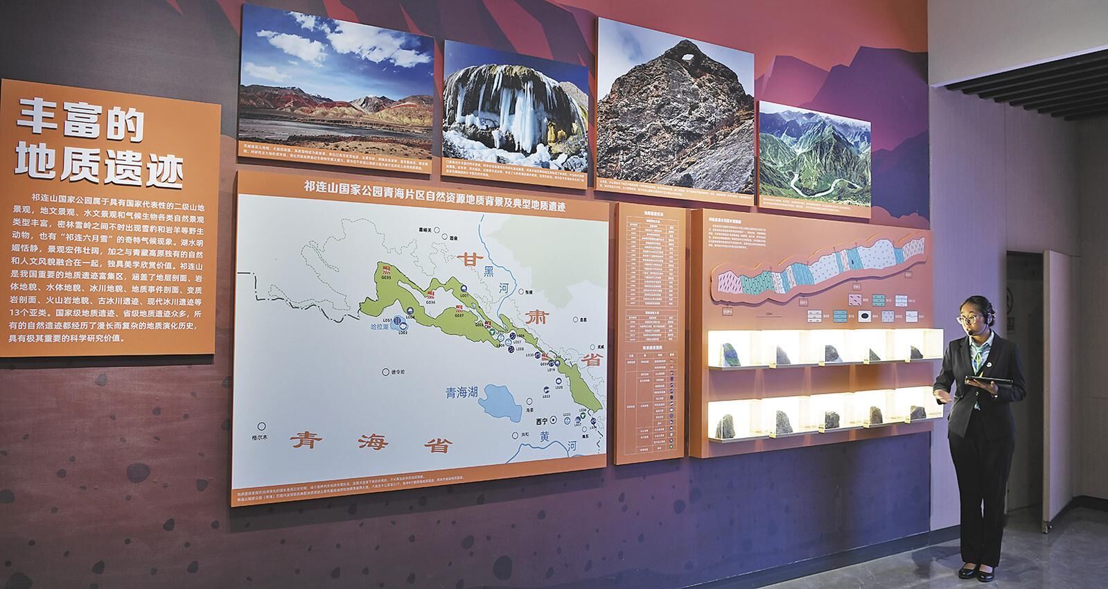 生態(tài)科普館內(nèi),講解員講解祁連山豐富的地質(zhì)遺跡。圖片由張多鈞才貢加楊紅霞攝