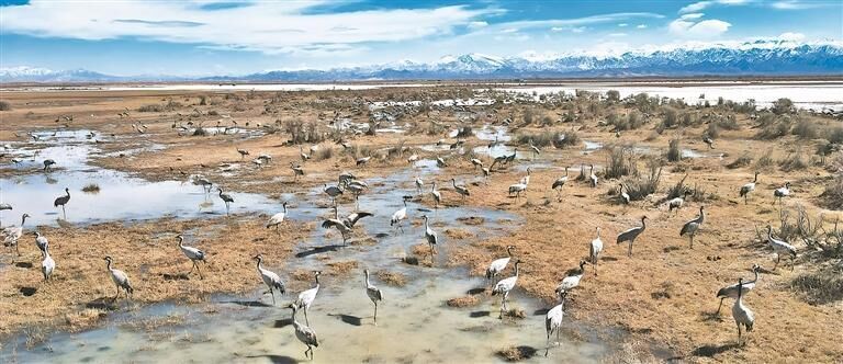 雪山腳下,灰鶴成群。