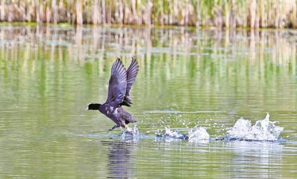 西寧市寧湖濕地,一只白骨頂雞掠過湖面。