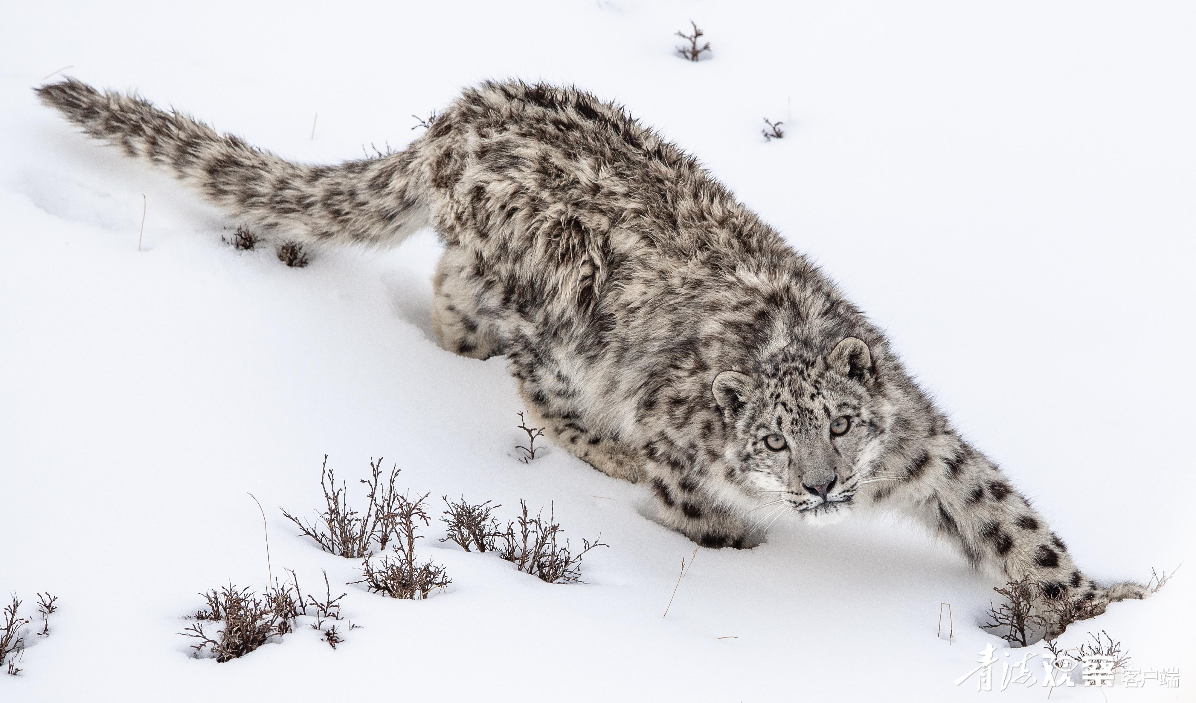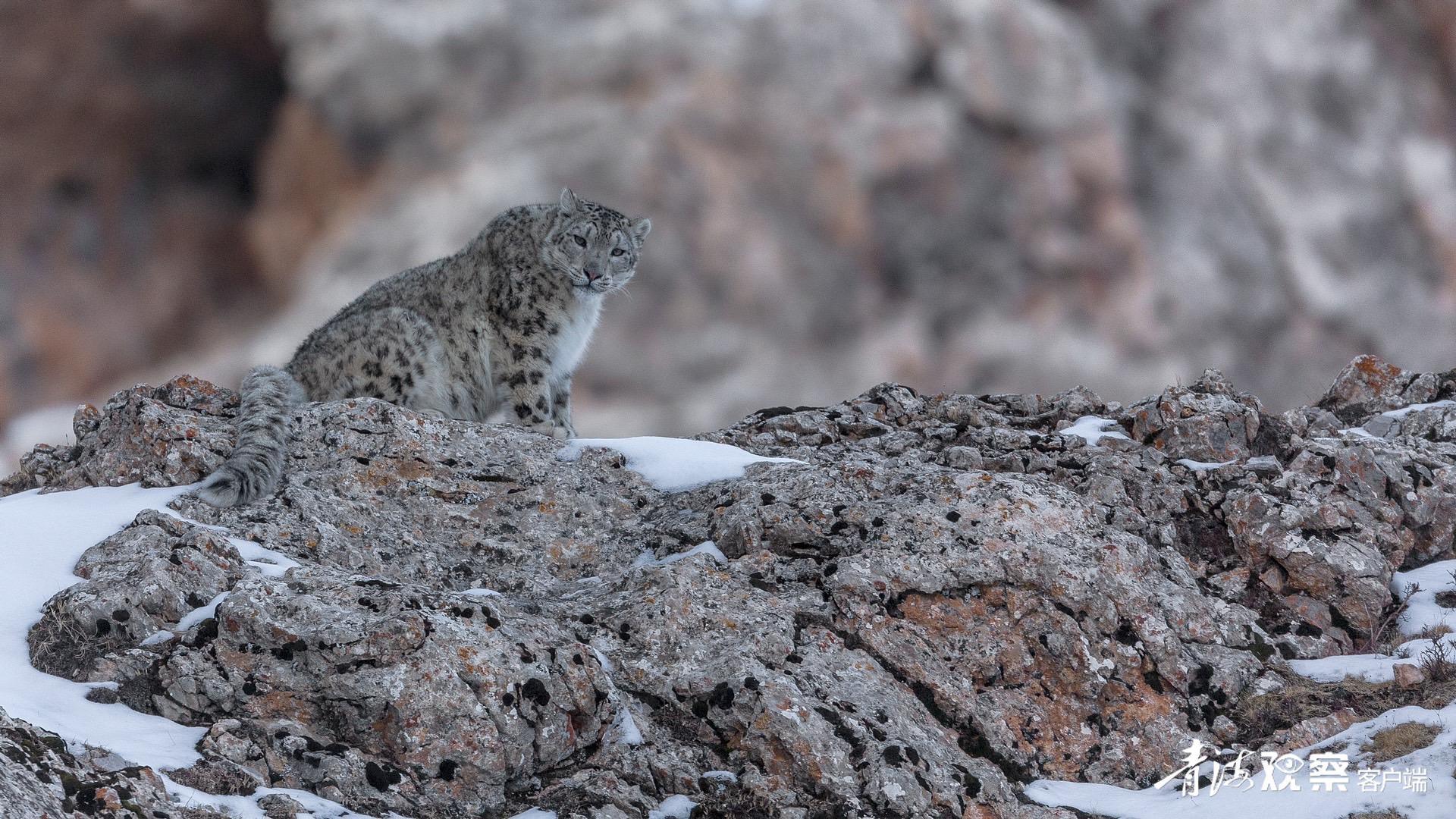 雪豹,皮毛灰白色,有黑色點斑和黑環,在巖石堆中是極好的保護色。因行蹤神秘,只有在下雪后才能看到它的足跡。由于雪豹是處于高原生態食物鏈頂端的食肉動物,也被人們稱為“高海拔生態系統健康與否的氣壓計”。