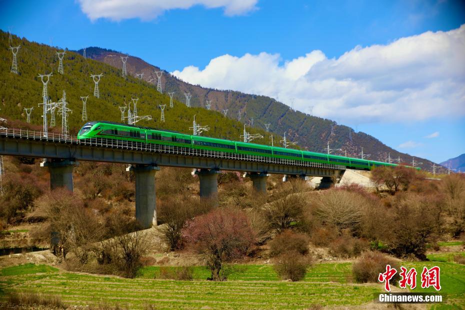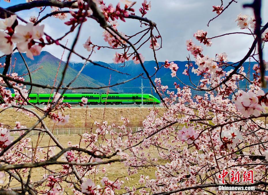 圖為拉林鐵路沿線桃花盛開,與飛馳而過的動車構成別樣風景圖。馬生明 攝