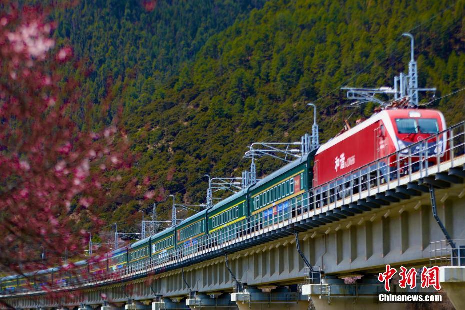 圖為拉林鐵路沿線桃花盛開,列車飛馳而過。四朗卓嘎 攝