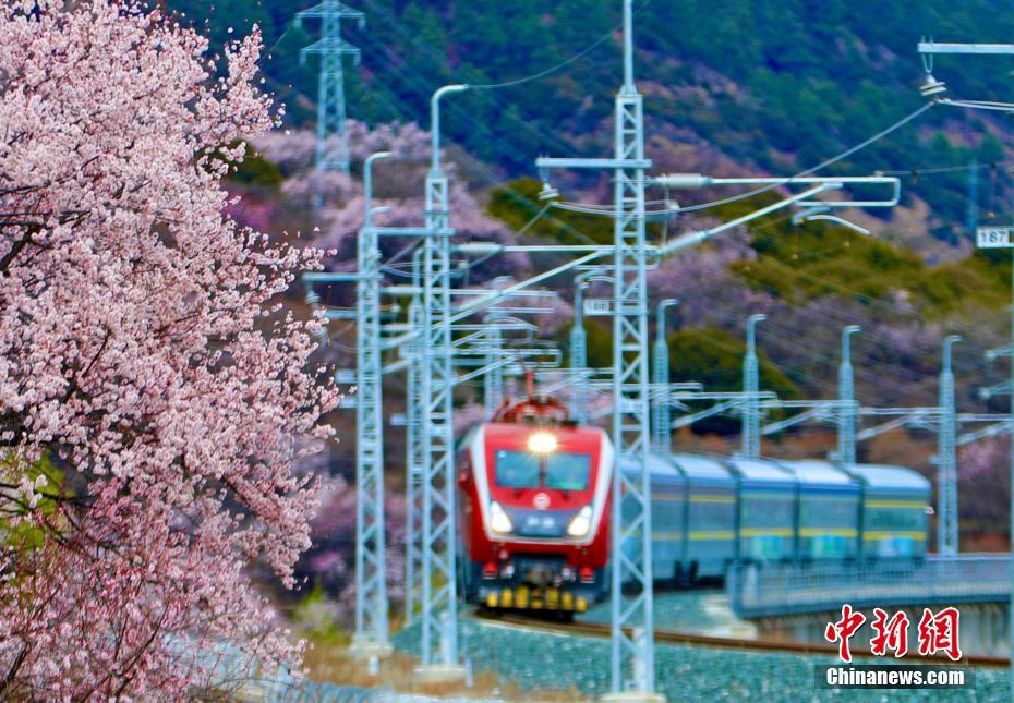 圖為列車穿越桃花花海。四朗卓嘎 攝