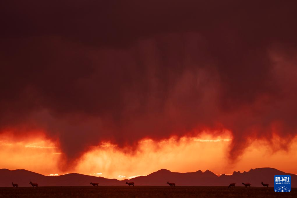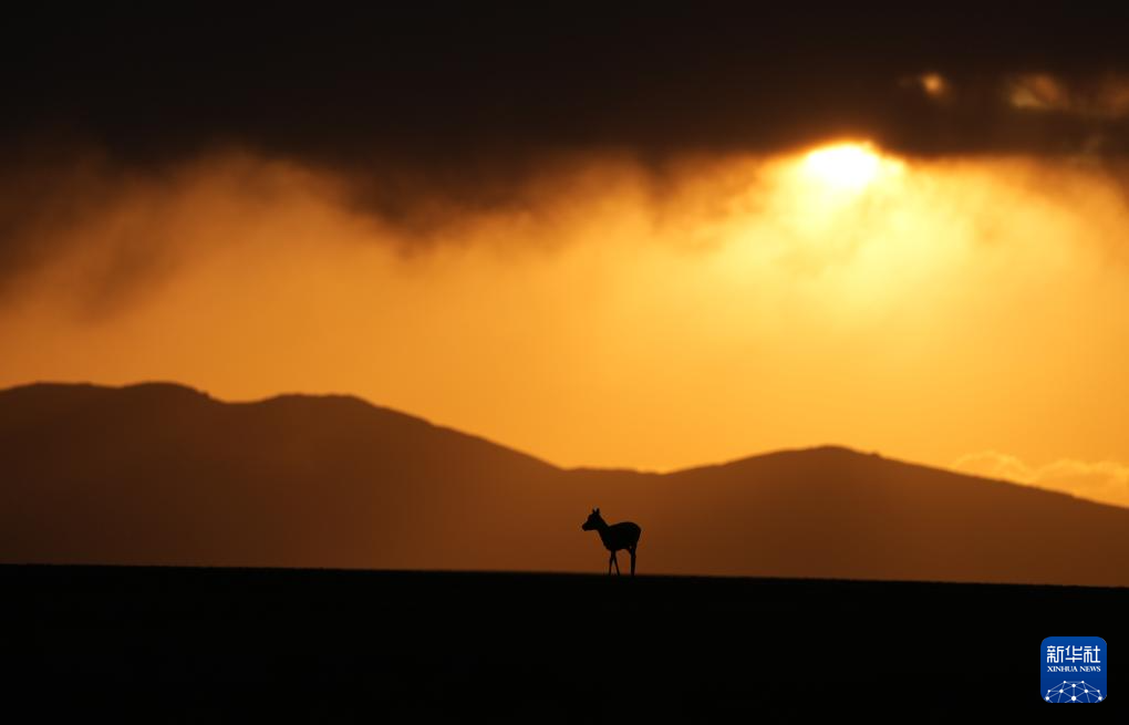 晚霞中待產的藏羚羊(6月16日攝)。新華社記者 費茂華 攝