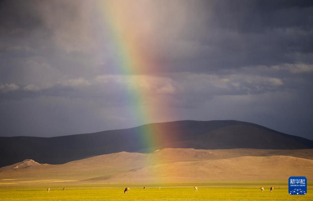 6月16日,彩虹下待產的藏羚羊。新華社記者 費茂華 攝
