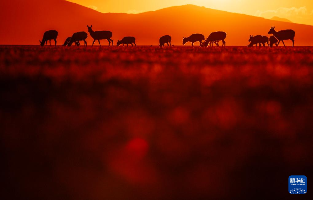 在魯確塘草原上,待產的藏羚羊在霞光的包圍中進食(6月16日攝)。新華社記者 費茂華 攝