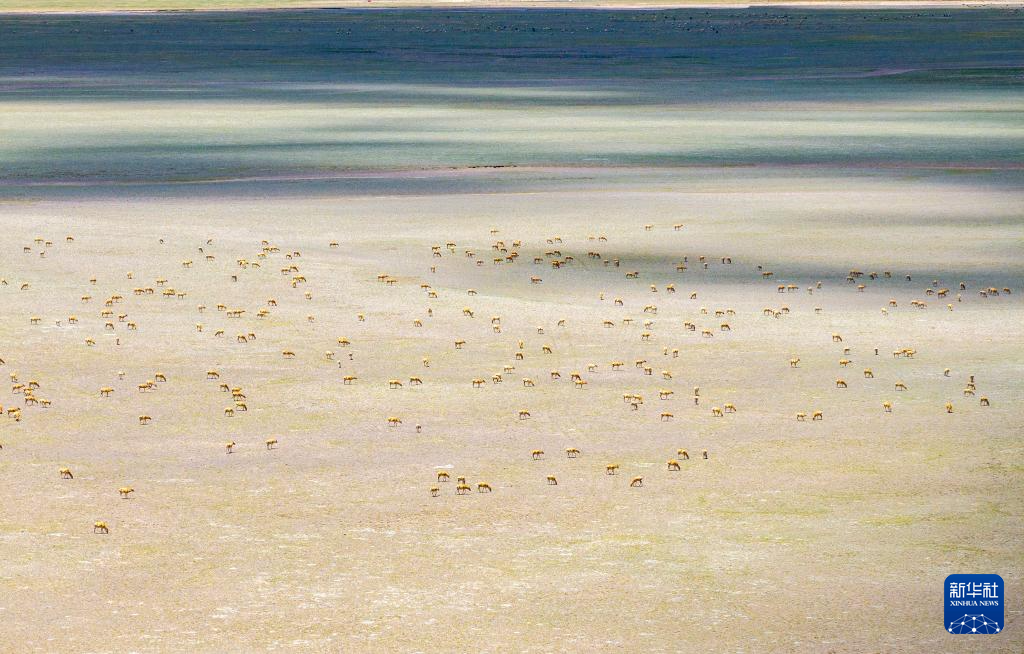 藏羚羊在魯確塘草原集結(無人機照片,6月8日攝)。新華社記者 姜帆 攝