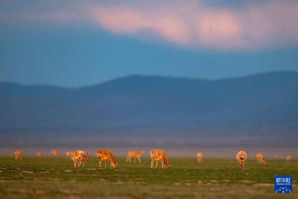 晚霞中魯確塘草原上待產的藏羚羊(6月16日攝)。新華社記者 費茂華 攝