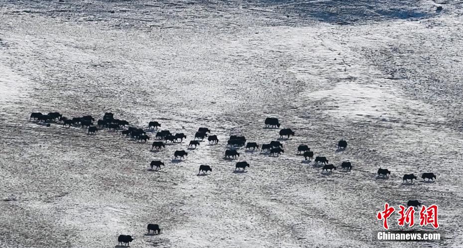 圖為無人機拍攝成群野牦牛在草地上覓食。宗布爾 攝