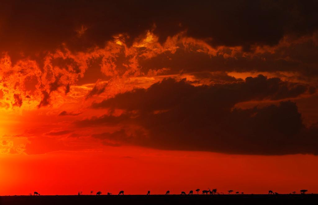 在馬賽馬拉國家保護區,遷徙中的野生動物在夕陽下覓食。