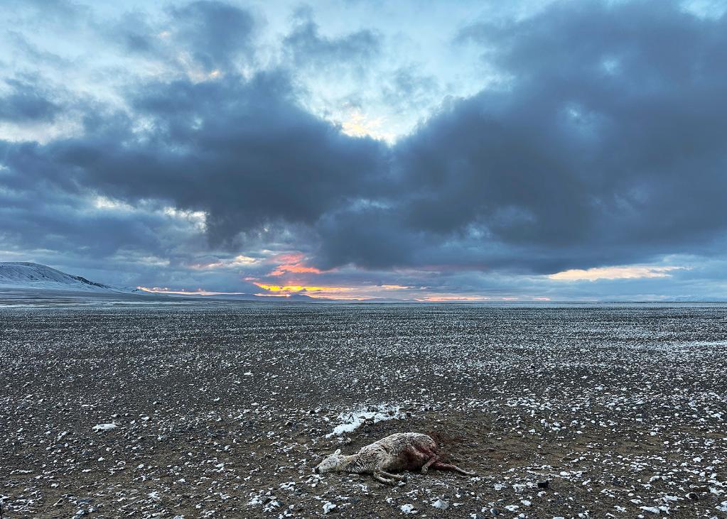 在羌塘國家級自然保護區,一只被野狼咬死的母藏羚羊躺在雪后的草原上。