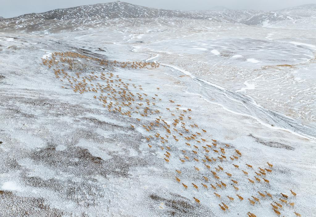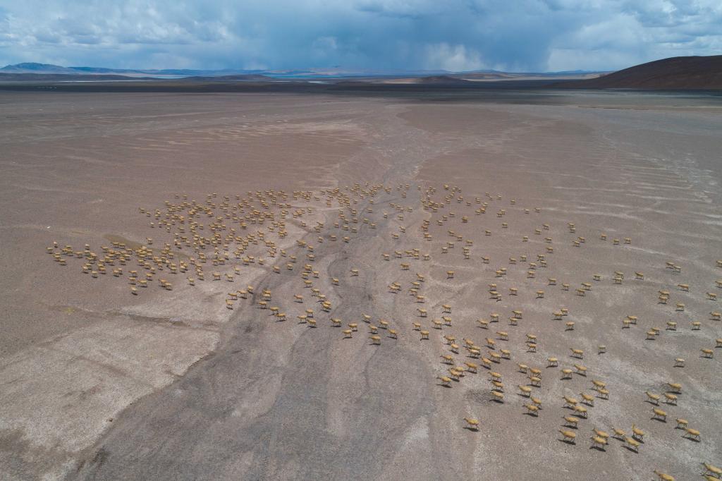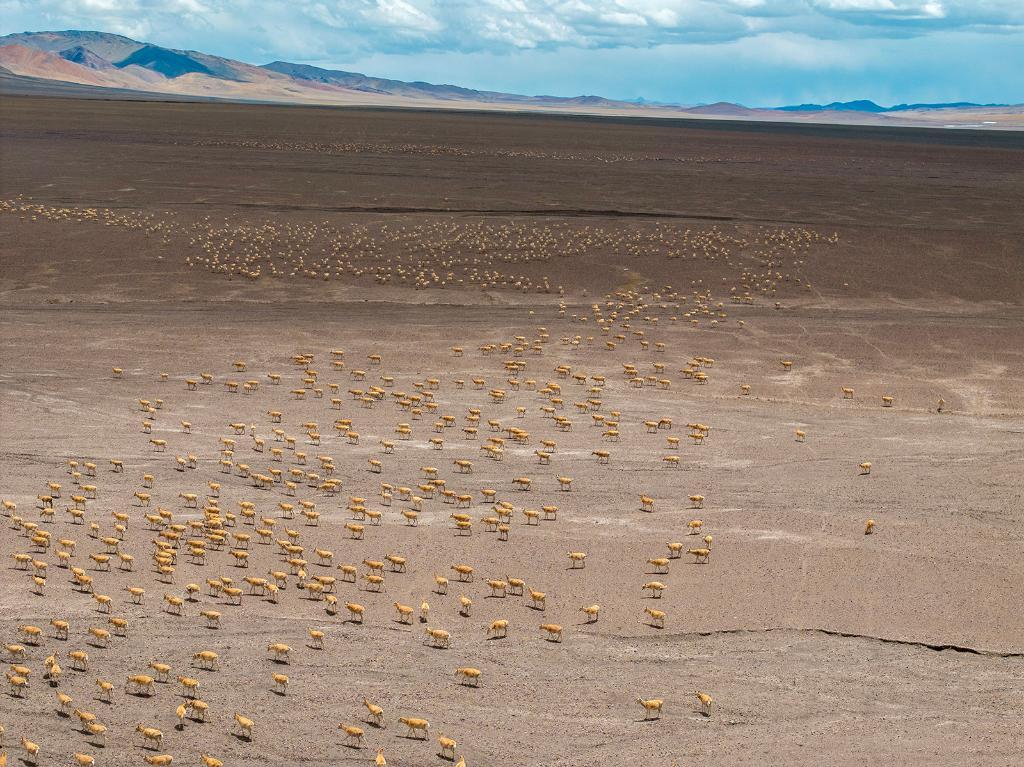 2024年5月10日,在羌塘國家級自然保護區,大群懷孕的雌性藏羚羊開始集結成群,向產羔地遷徙。