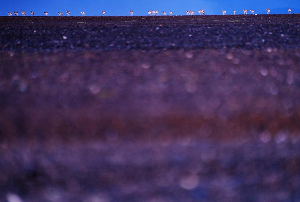 在羌塘國家級自然保護區,藏羚羊在夕陽下覓食。