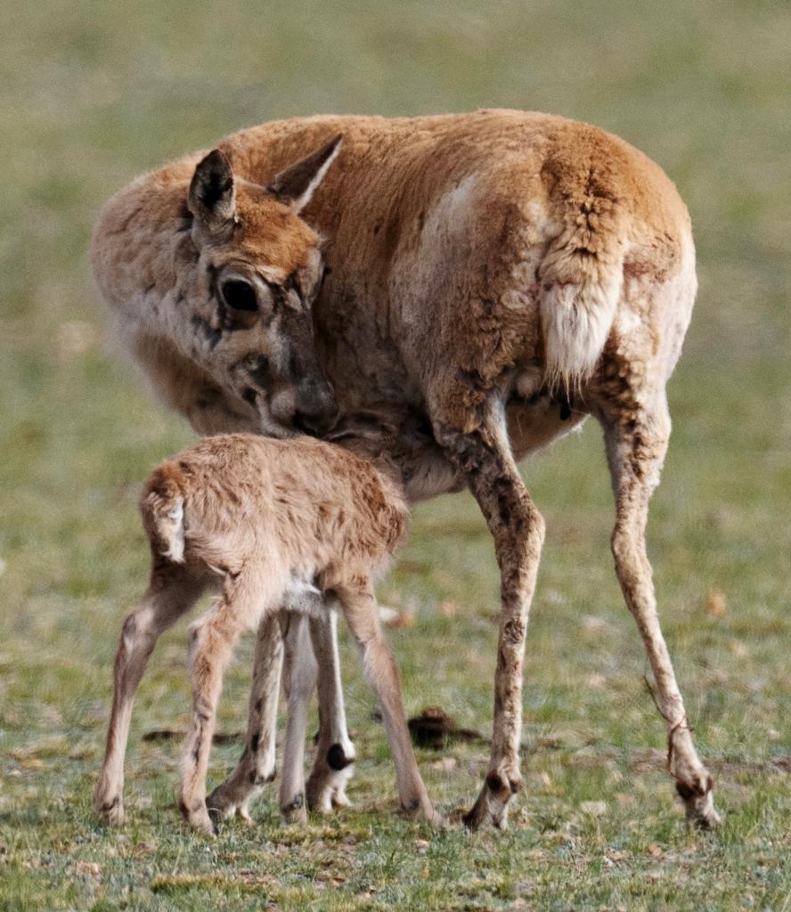 2024年6月17日,羌塘國家級自然保護區境內的西藏那曲市申扎縣買巴鄉魯確塘草原上一只剛出生不久的小藏羚羊在吃奶。