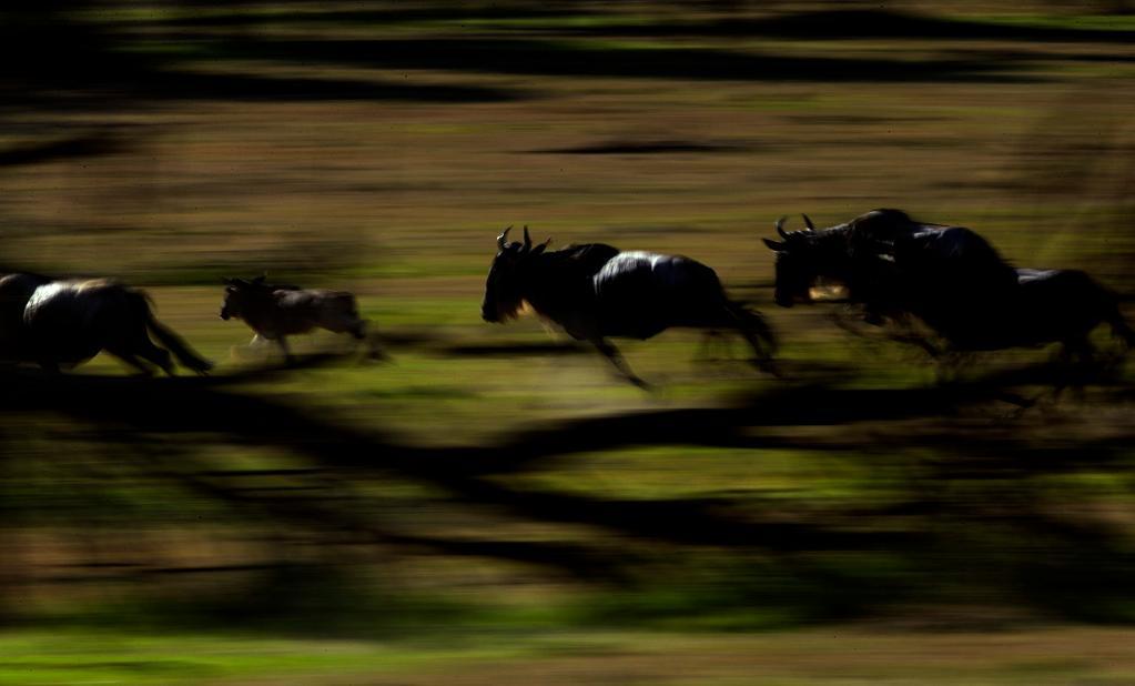 在馬賽馬拉國家保護區,遷徙中的角馬因為感受到某種危險而奮力奔跑。