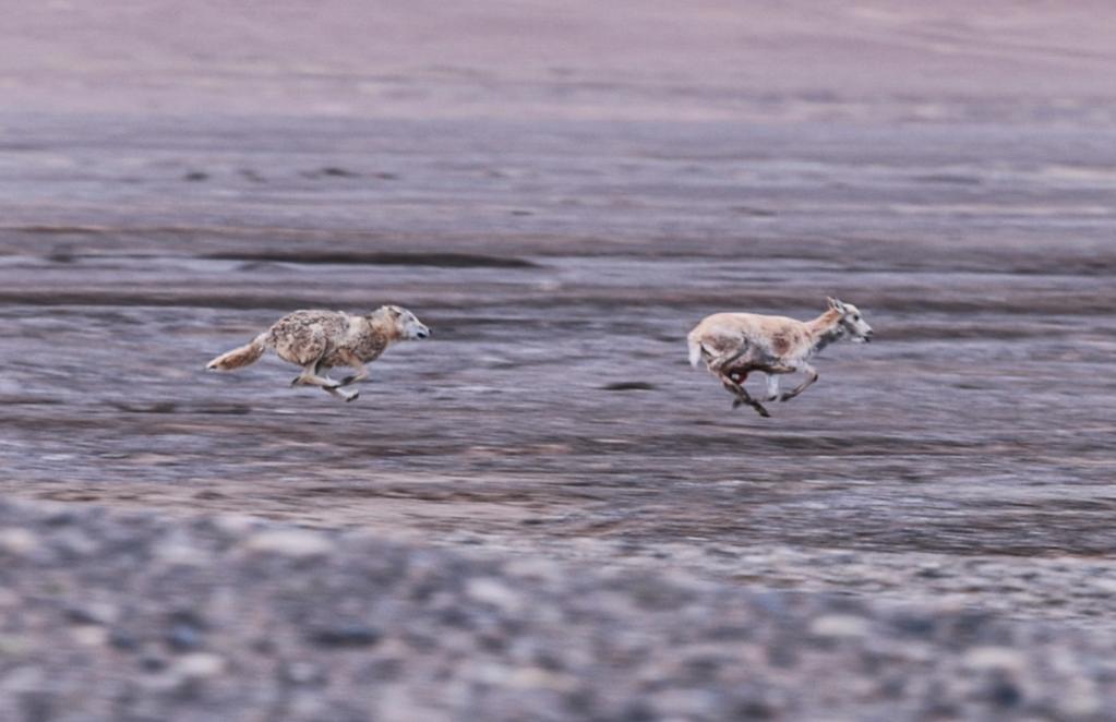 在羌塘國家級自然保護區,一只野狼正在捕食遷徙中的母藏羚羊。在藏羚羊的遷徙過程中,野狼、雪豹、藏馬熊和藏野狐等掠食動物守候在遷徙路上,隨時準備捕食。