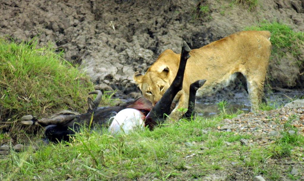 在馬賽馬拉國家保護區,一頭獅子正在享用自己的獵物。