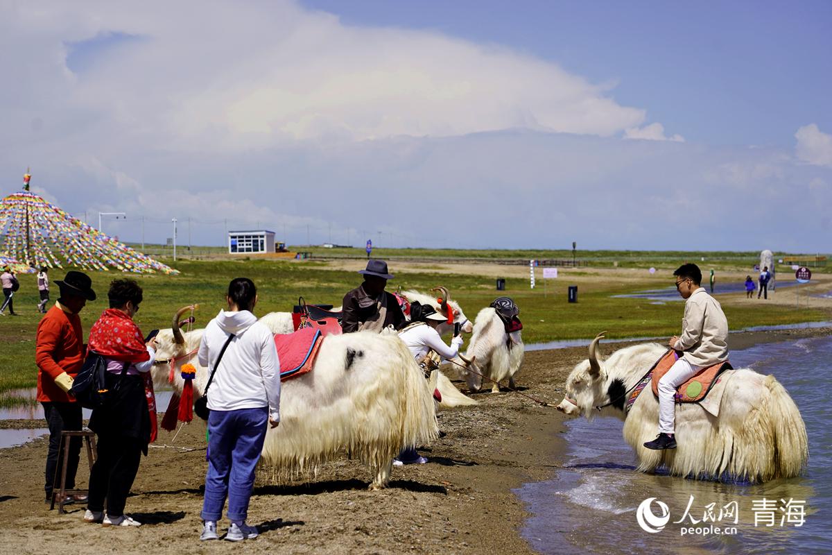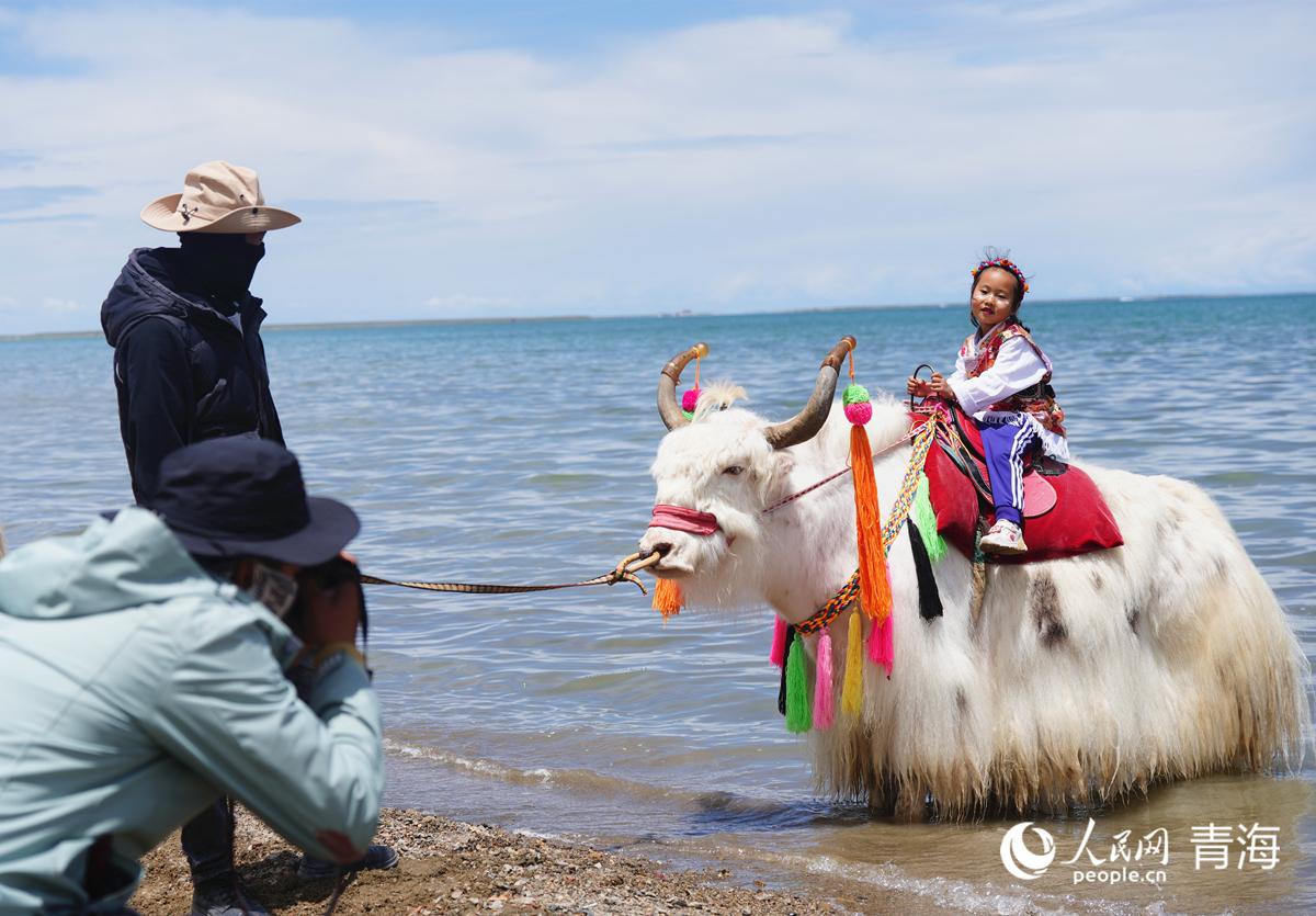 上班時間到,尕瑪本牽著白牦牛來到了青海湖景區的西湖灘,與其他村民家的二三十頭白牦牛排排站立在湖邊,靜待游客前來觀賞、騎行、拍照。