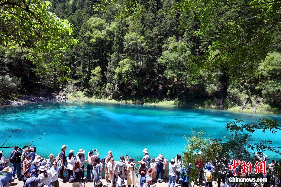 圖為游客在五彩池參觀。中新社記者 安源 攝