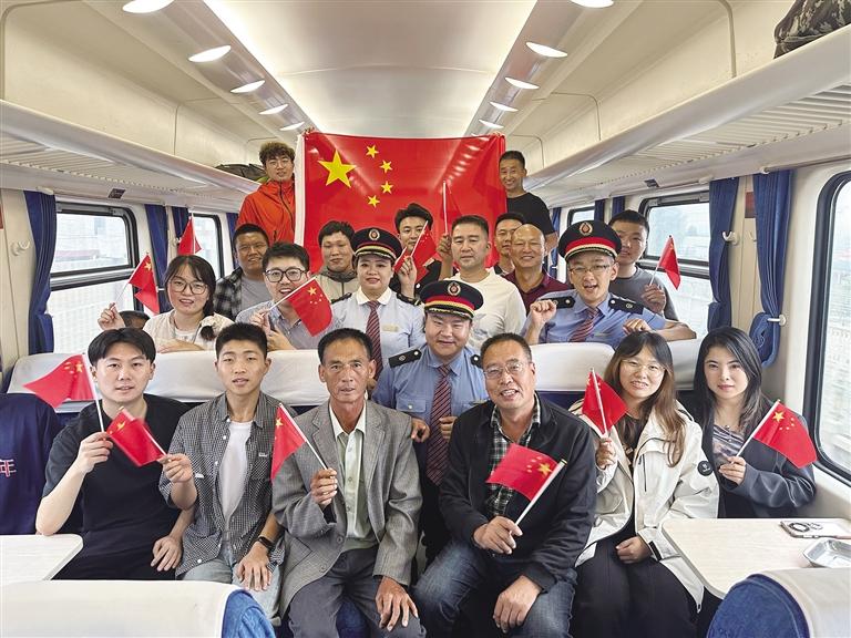 列車員與旅客合影慶祝國慶節。圖由周悅翔 楊寶森提供